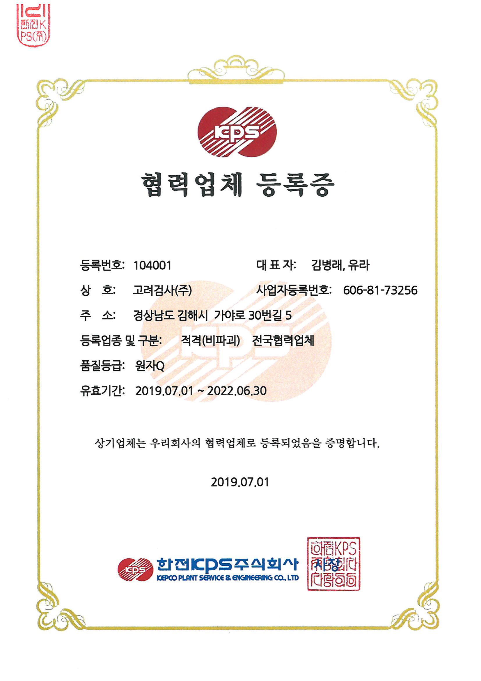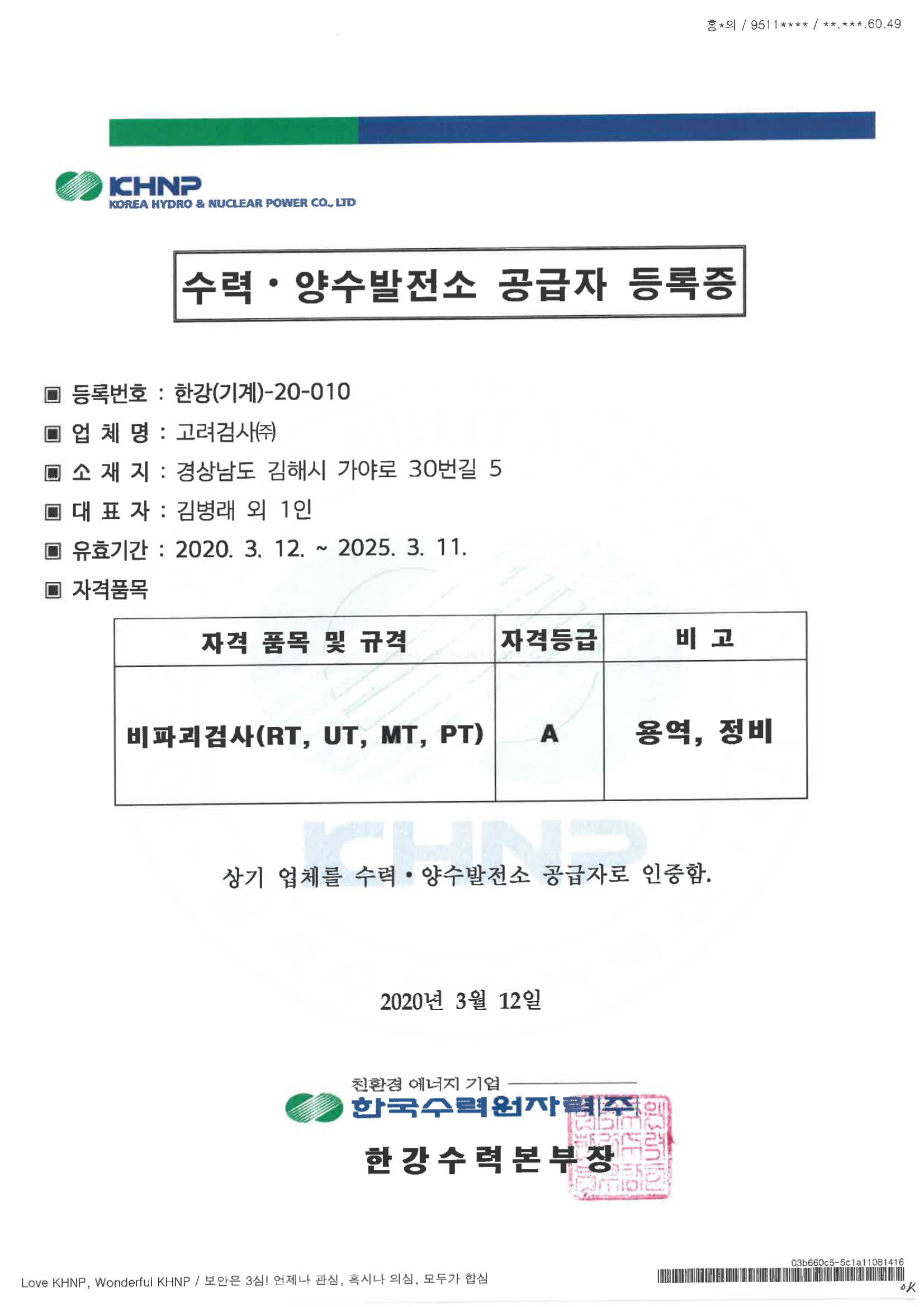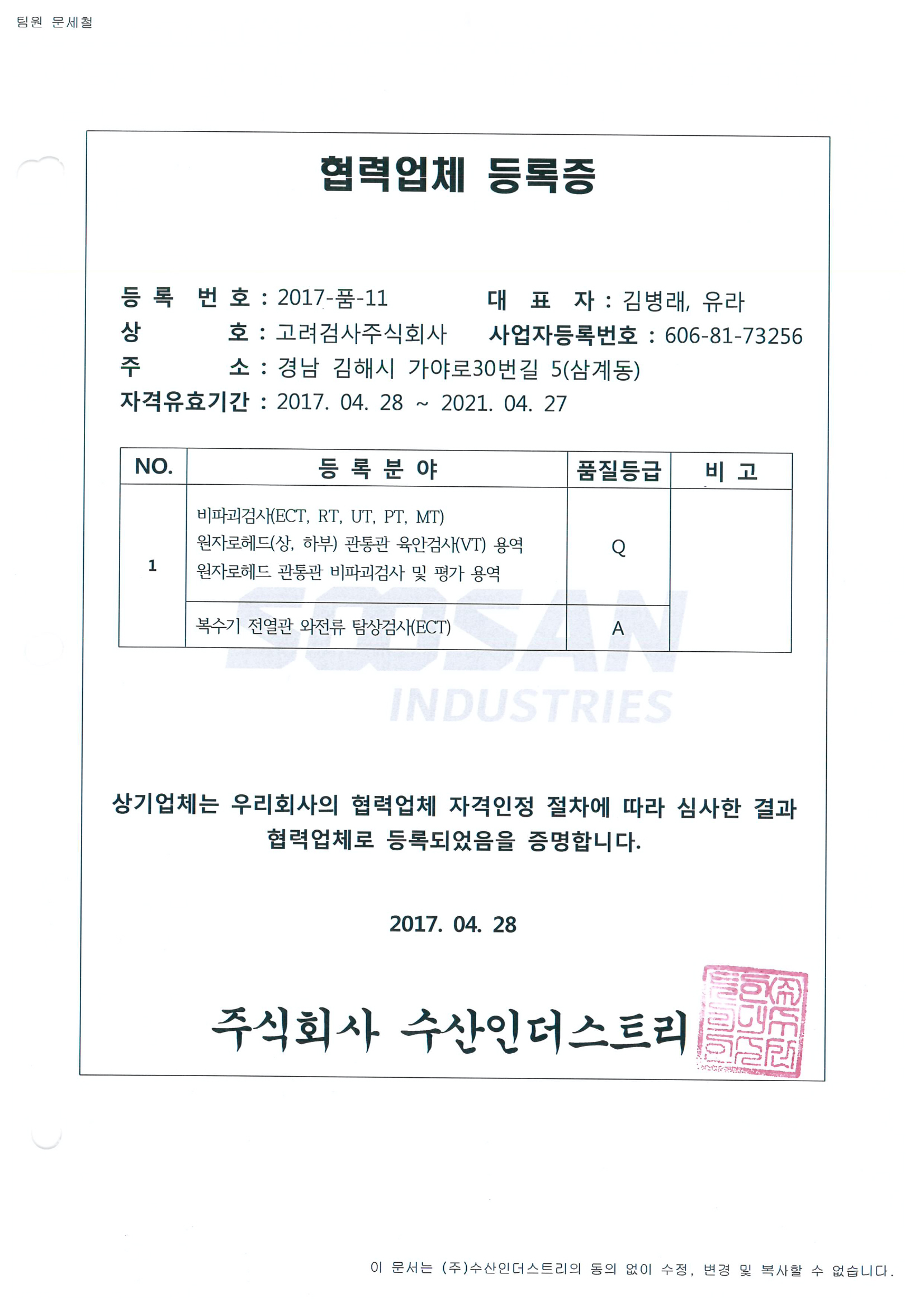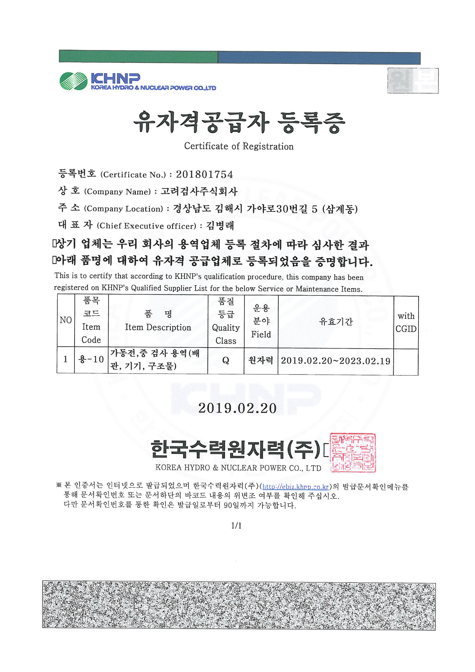 유자격공급자 등록증-가동전,중 검사 용역(배관,기기,구조물)