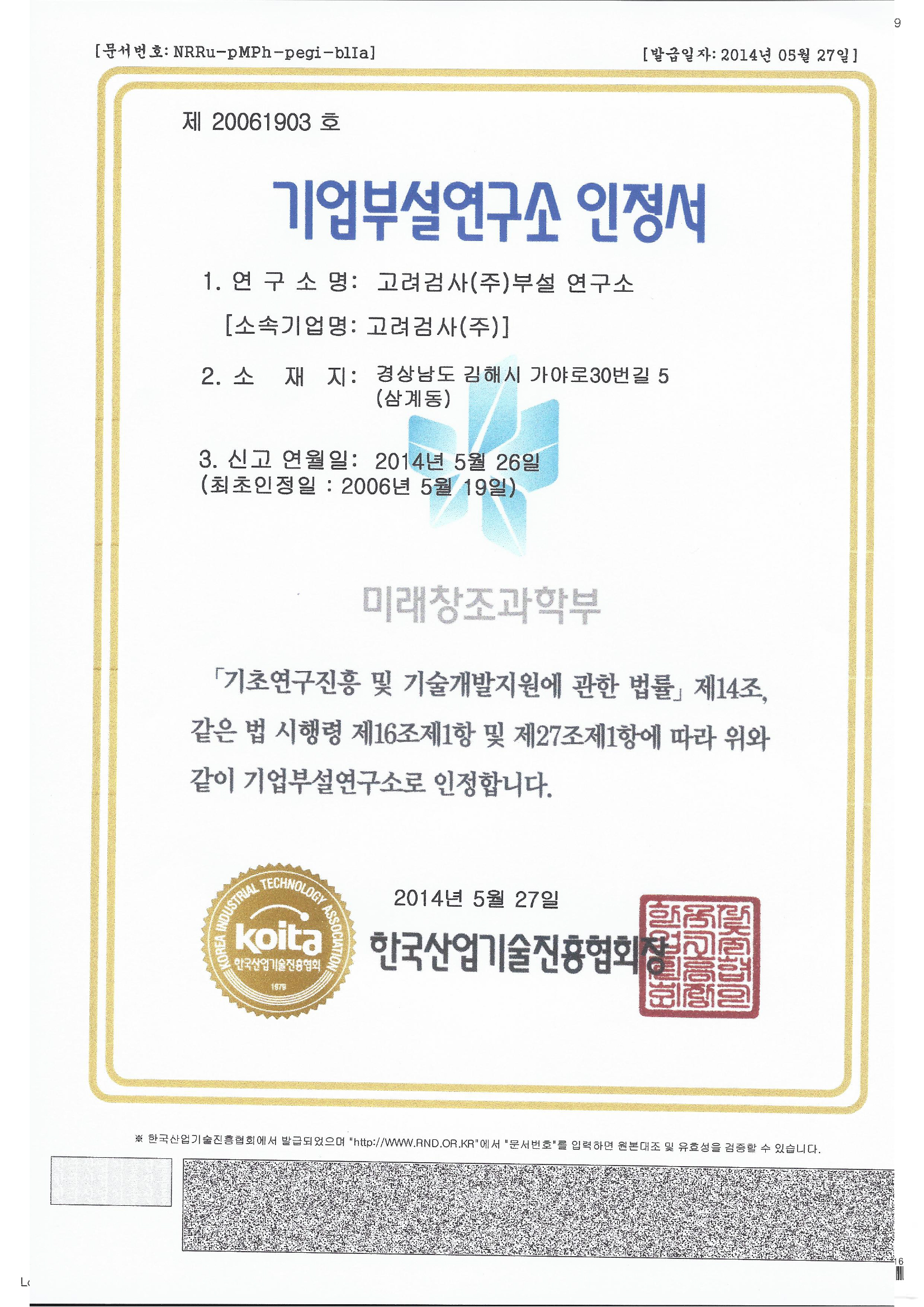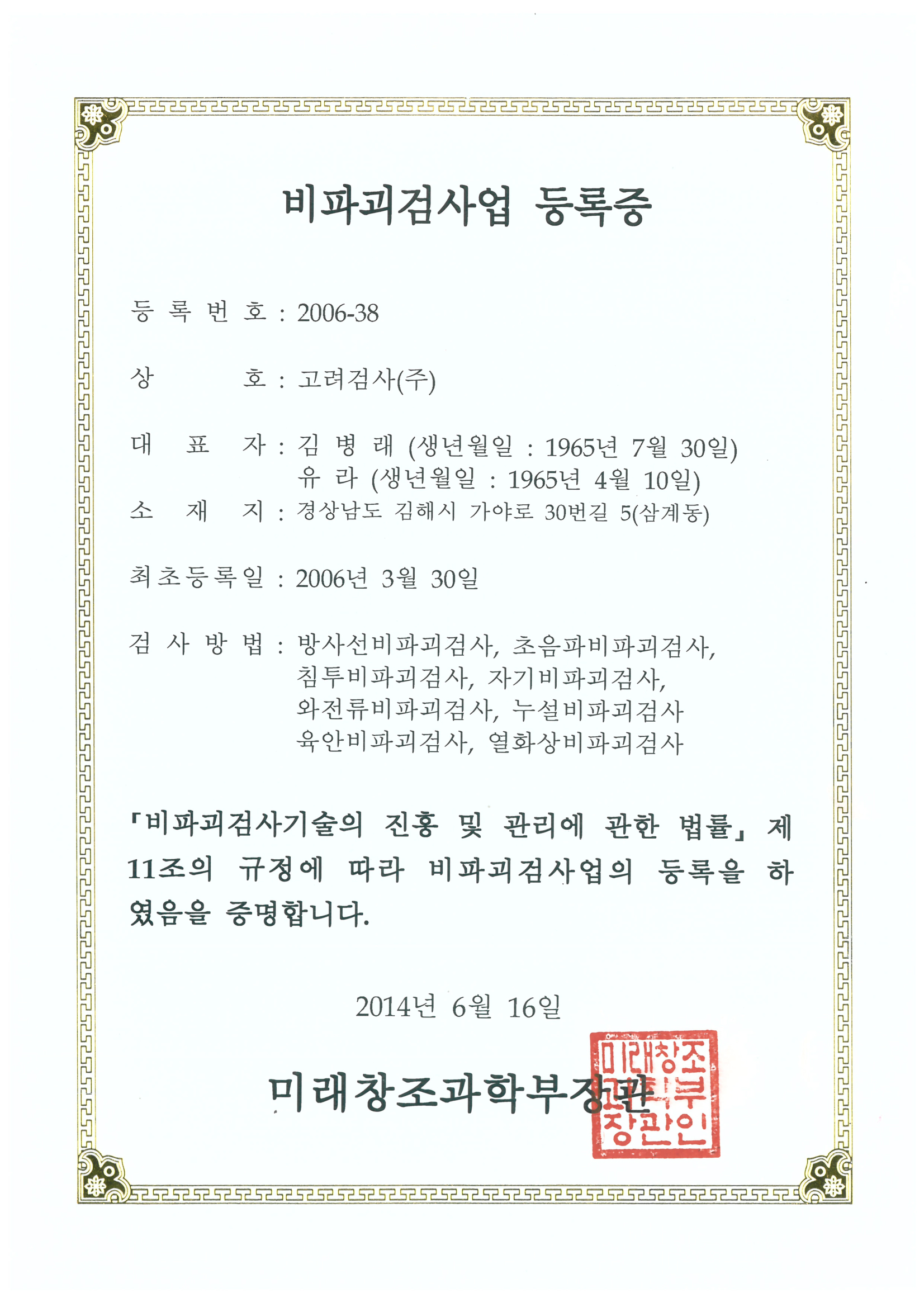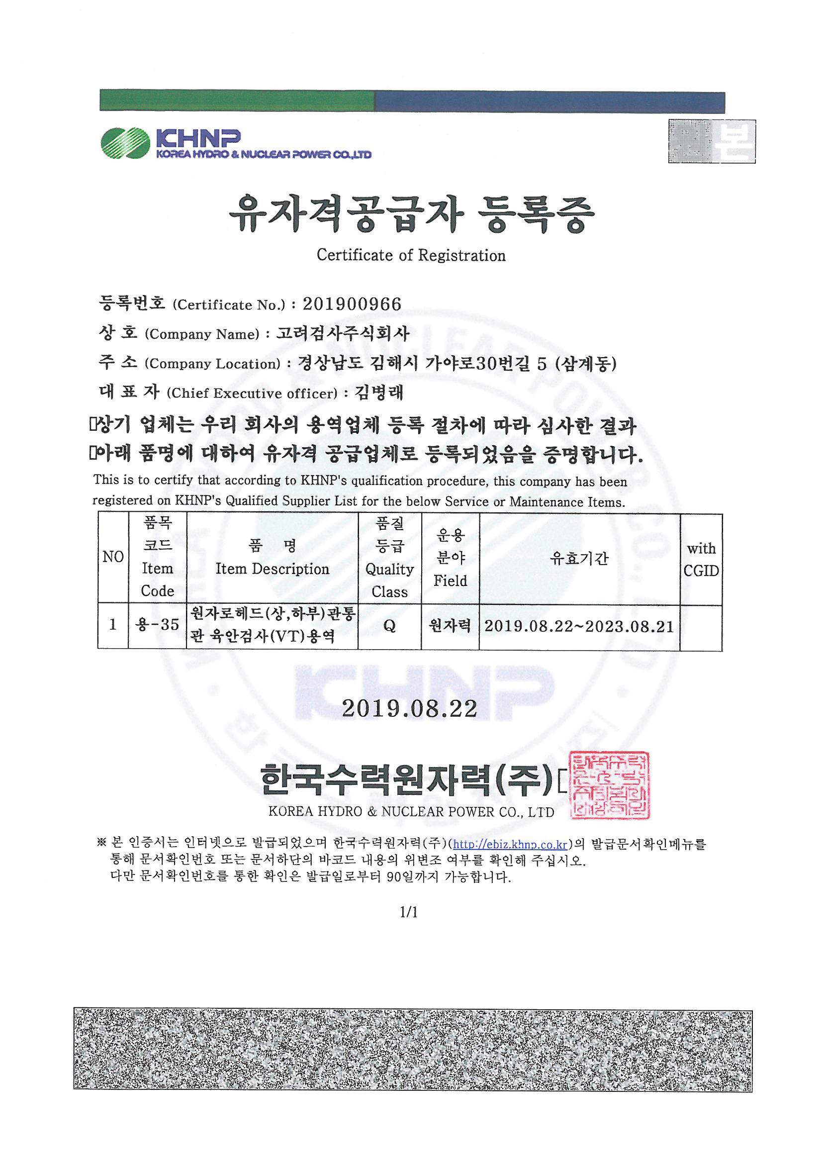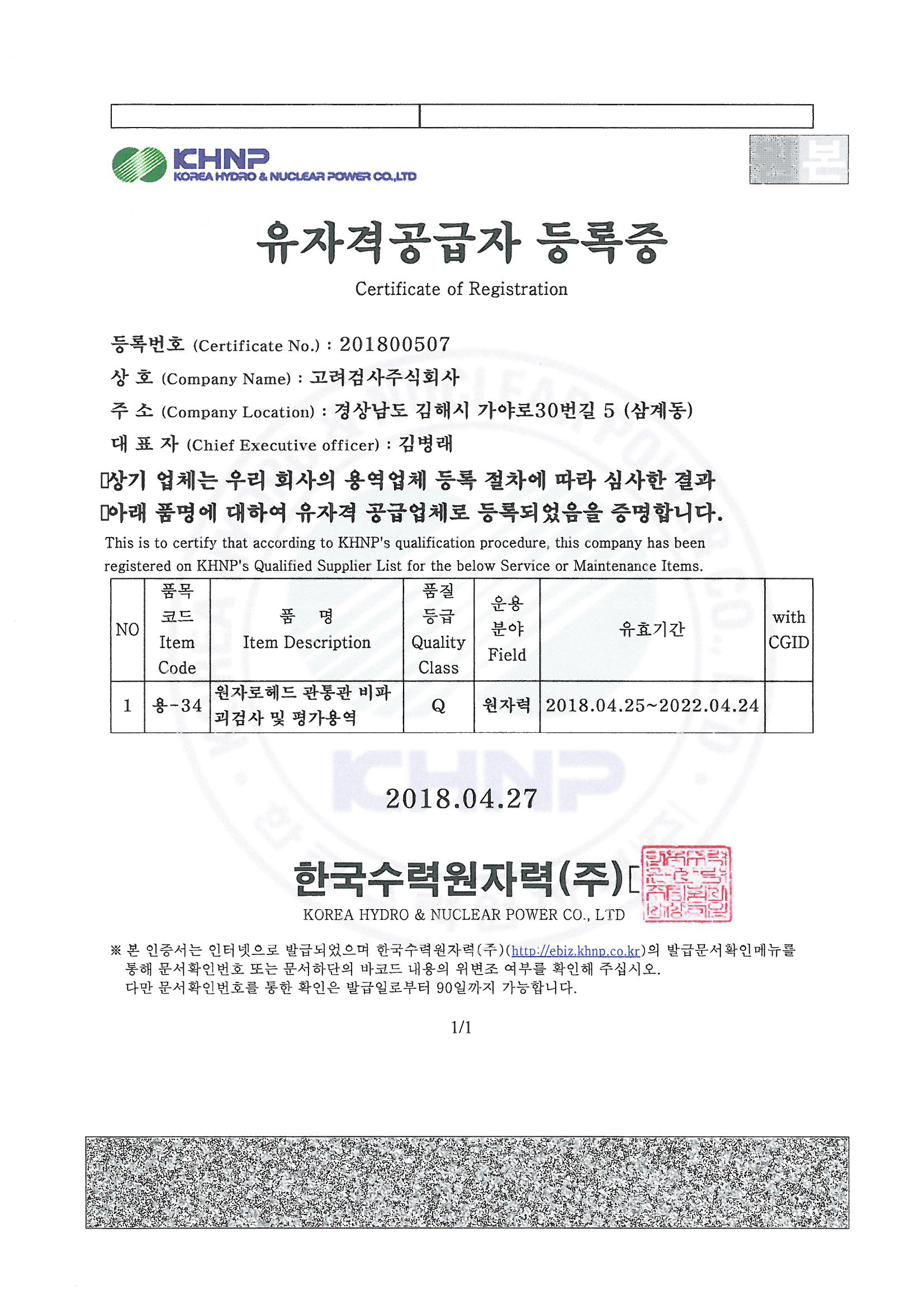 유자격공급자 등록증-원자로헤드 관통관 비파괴검사 및 평가용역