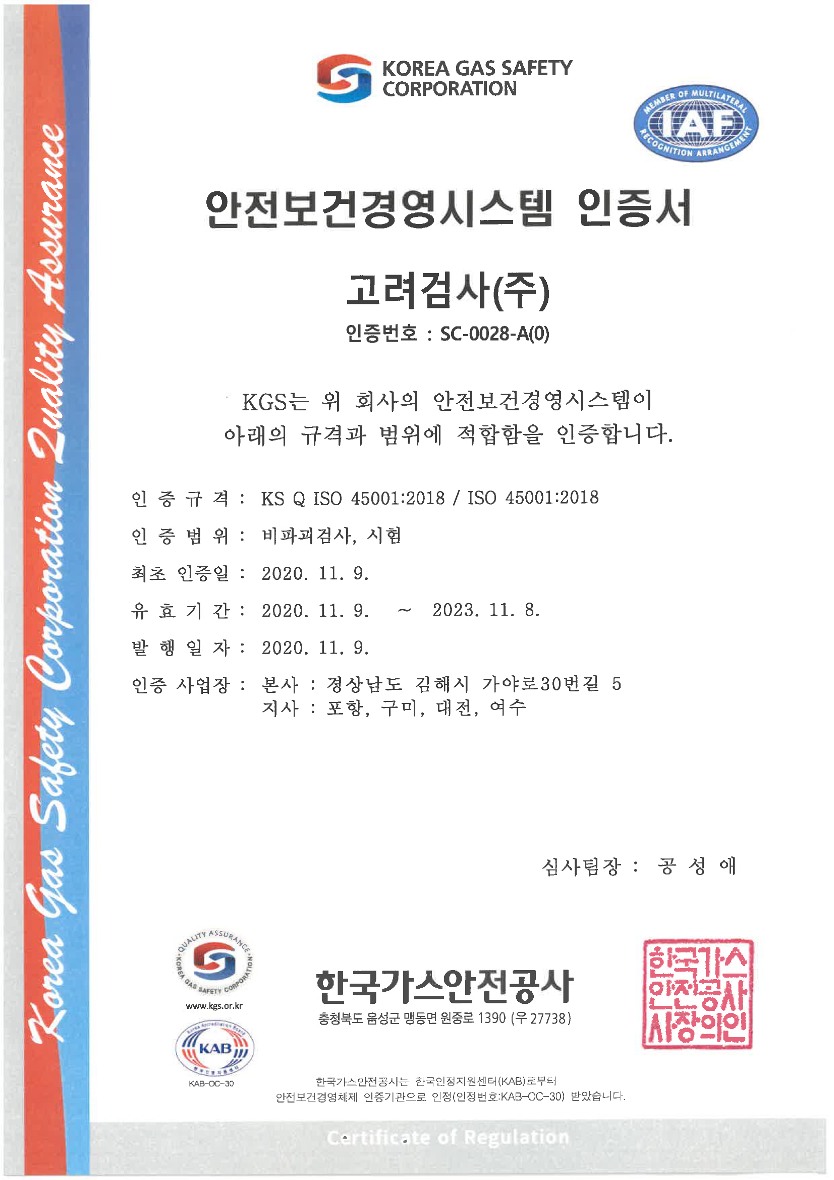 안전보건경영시스템인증서(KS Q ISO 45001:2018 / ISO 45001:2018)