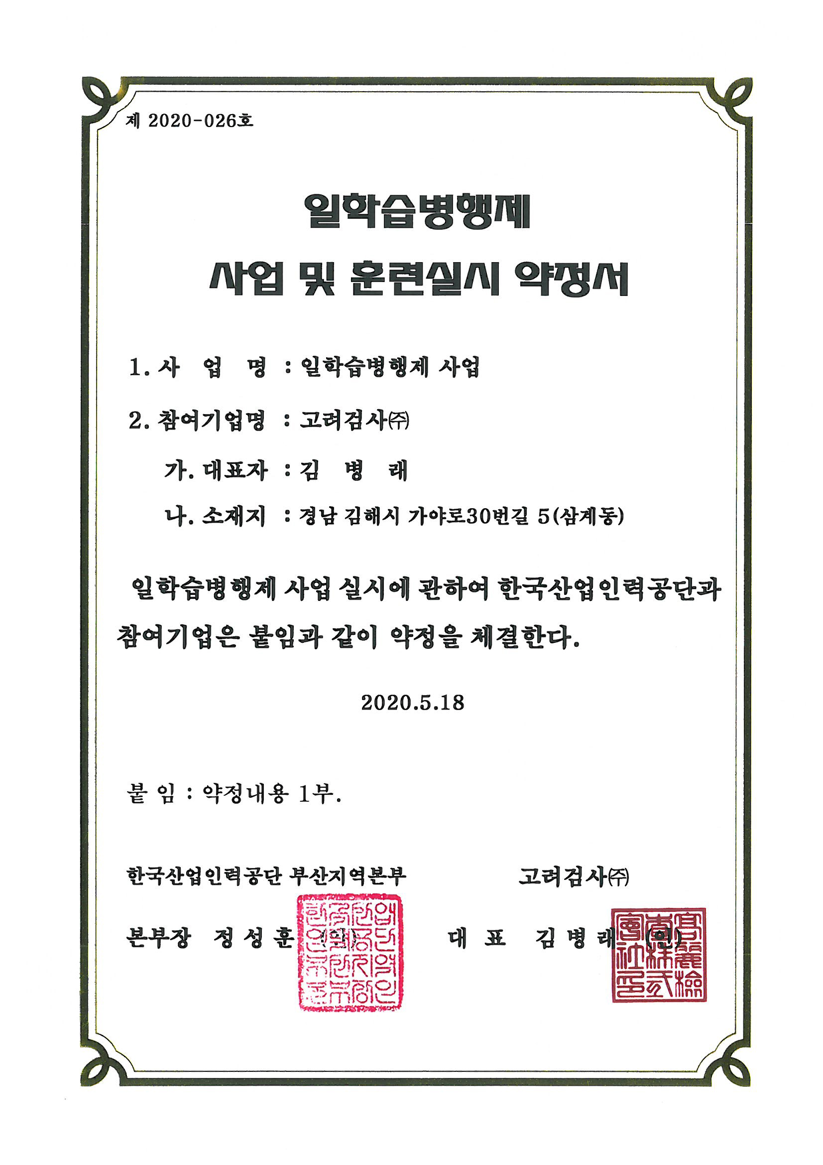 일학습병행제 사업 및 훈련실시 약정서_한국산업인력공단