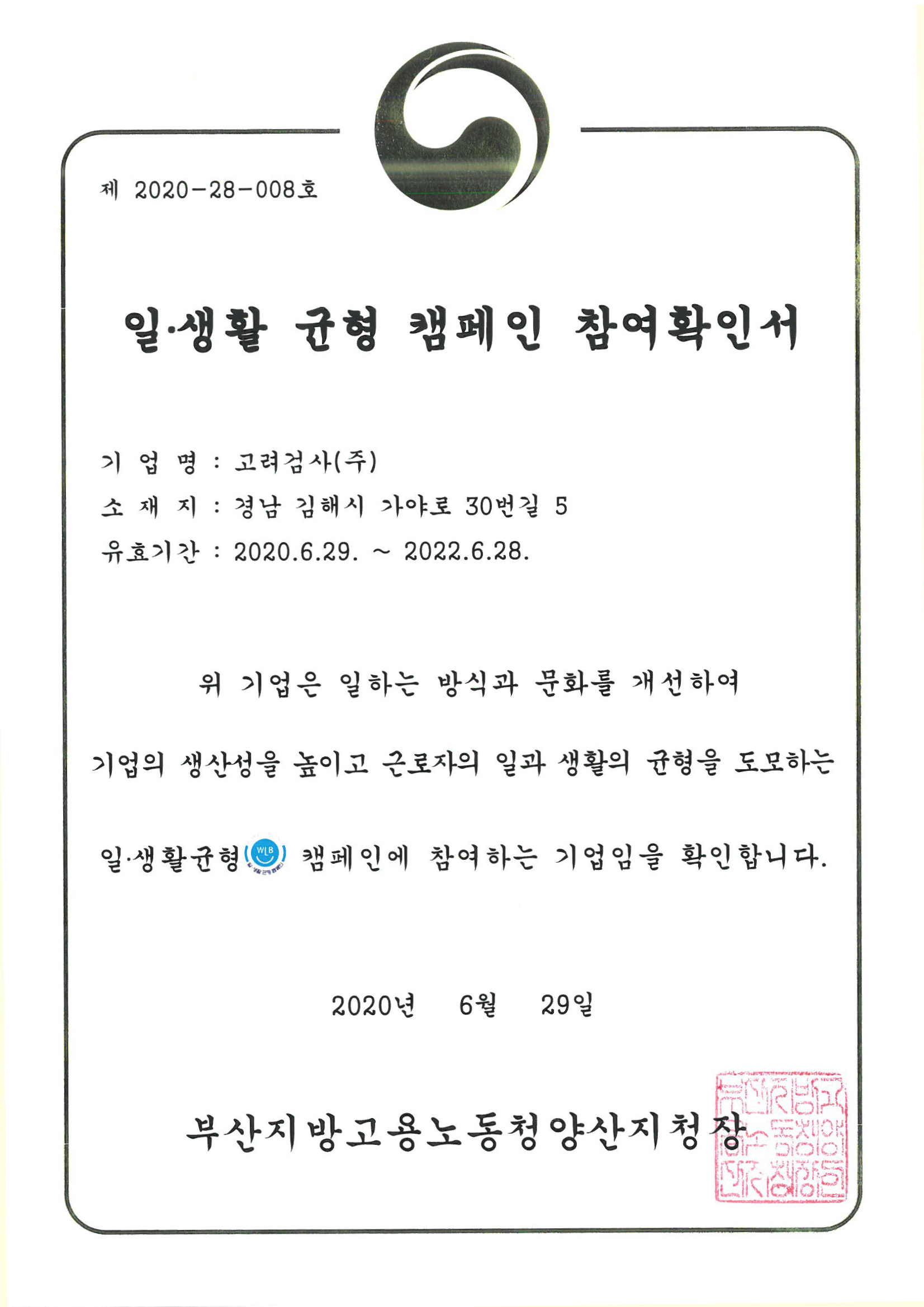 일생활균형캠페인 참여확인서(부산지방고용노동청)