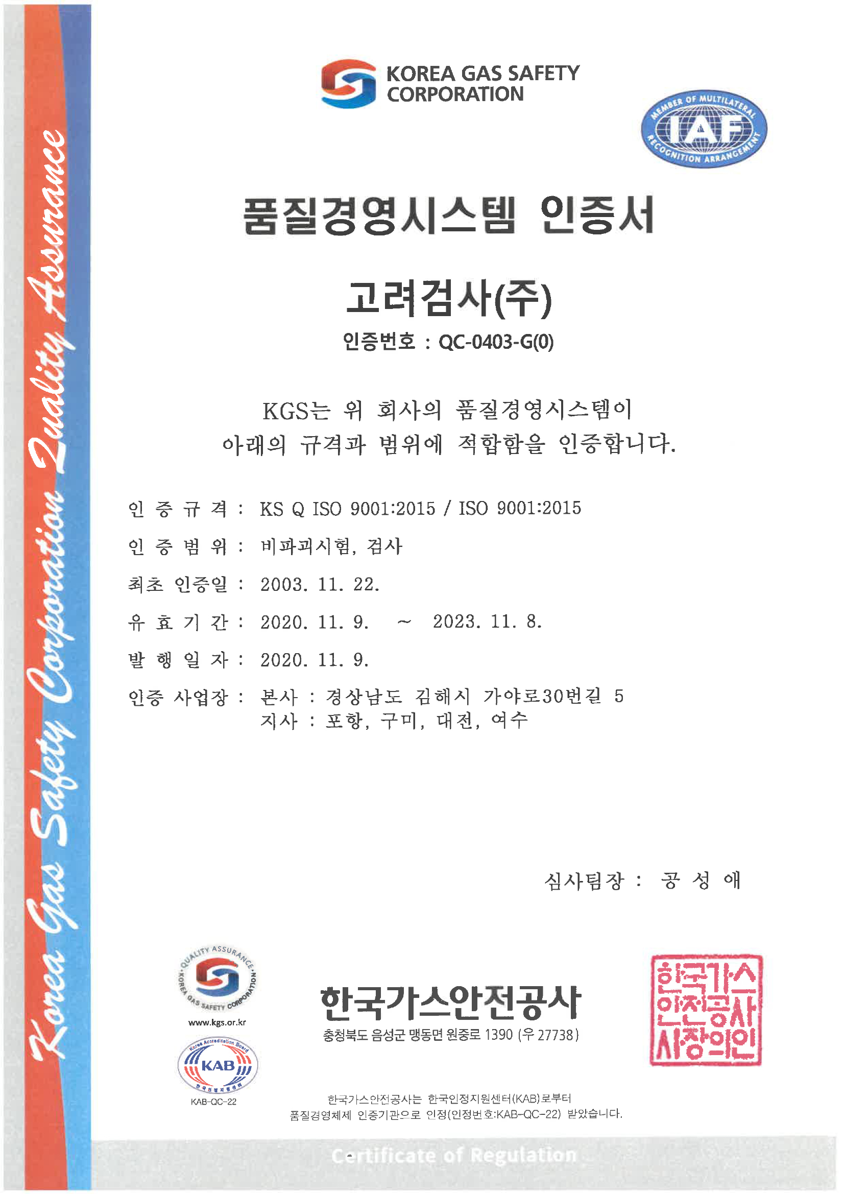 품질경영시스템인증서(KS Q ISO 9001:2015 / ISO 9001:2015)